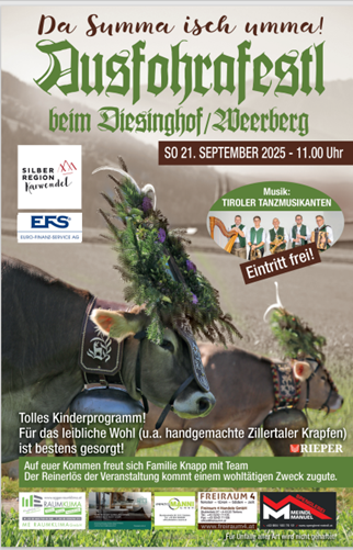 Das schon traditionelle Ausfohrafestl am Diesinghof in Weerberg ist heuer für Sonntag, 21. September angesagt. Bereits um 11.00 Uhr steigt das Fest mit regionalen Schmankerln u.a. mit handgemachten Zillertaler Krapfen und Melchermuas, musikalischen Darbietungen der Gruppe „TIROLER TANZMUSIKANTEN", ehe das Almvieh gegen Mittag am Diesinghof eintreffen wird. Ebenfalls erwartet euch ein kleiner Handwerksmarkt, Weißenbläser und ein tolles Kinderprogramm. Auf Euren Besuch freuen sich Familie Knapp mit Team. Der Reinerlös der Veranstaltung kommt einem wohltätigen Zweck zugute.